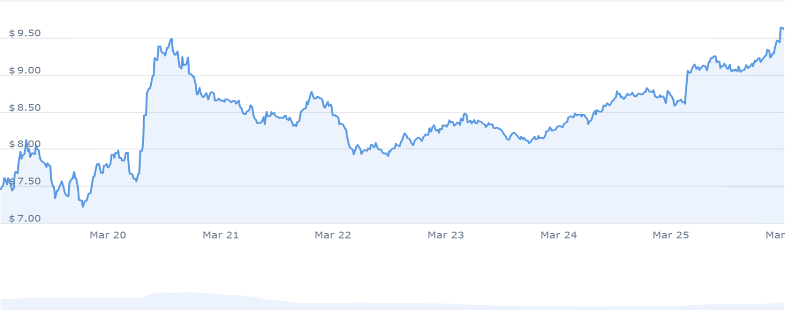 THORChain (RUNE), similarly, has witnessed a significant uptick in its market activity, approaching its peak performance levels. The crypto’s recovery from a temporary setback, dropping below the $11 benchmark, to a robust trading price of $9.64 showcases its volatile yet upward trajectory.