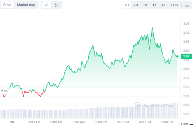 Fetch.ai (FET) stands out, especially with the growing interest in AI tokens. The token’s interest is propelled by their growing use cases and the spotlight from events like the NVIDIA Artificial Intelligence conference. Fetch.ai, in particular, has seen remarkable growth, with a 12.26% increase in its last session, trading at $2.83.