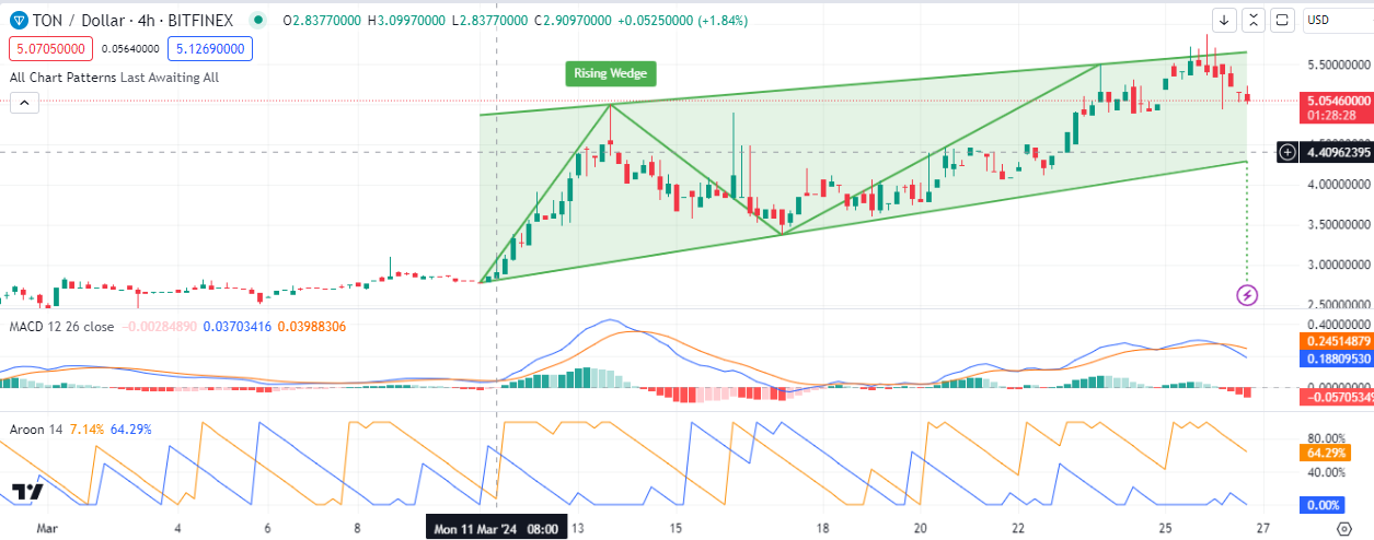 The 4-hour TON/Dollar chart indicates a rising wedge formation, which is traditionally interpreted as a bearish pattern in technical analysis. This pattern emerges when the price makes higher highs and higher lows within converging trend lines, hinting at a potential trend reversal. Notably, TON’s price has not yet broken out of the wedge, which suggests that traders might be on the lookout for either a breakout or a breakdown from this pattern to confirm the future direction of the price movement.
