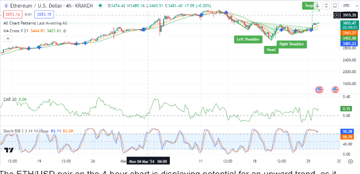 Moreover, the ETH/USD pair exhibits a promising bullish pattern on the 4-hour chart, hinting at a potential inverted head and shoulders formation, a classic sign of bullish reversal. With the Stochastic RSI pointing to strong momentum and the Chaikin Money Flow (CMF) indicating dominant buying pressure, Ethereum’s price is positioned for an upward breakout. Should Ethereum surpass the neckline near $3,555, the pathway towards the $4,000 mark appears increasingly plausible, especially with market sentiment leaning towards optimism as suggested by technical analysts.