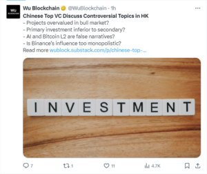 These included the valuation of projects in bull markets, the comparison between primary and secondary market investments, the potential overhype surrounding AI and Bitcoin Layer 2 technologies, and the concerns around the monopolistic tendencies of major exchanges like Binance. The dialogue offered a deep dive into the strategic thinking that drives VC investments in the rapidly evolving digital asset space.