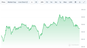 Render Token (RNDR) stands at the forefront of this new wave. Operating under the Render Network Foundation, this token facilitates decentralized GPU solutions aimed at transforming digital creation. A significant nod of approval came from Coinbase, which not only featured RNDR on its roadmap but also enabled trading of the token. Despite a recent 30% drop from its all-time high, RNDR maintains a strong market presence with its current price around $9.60.